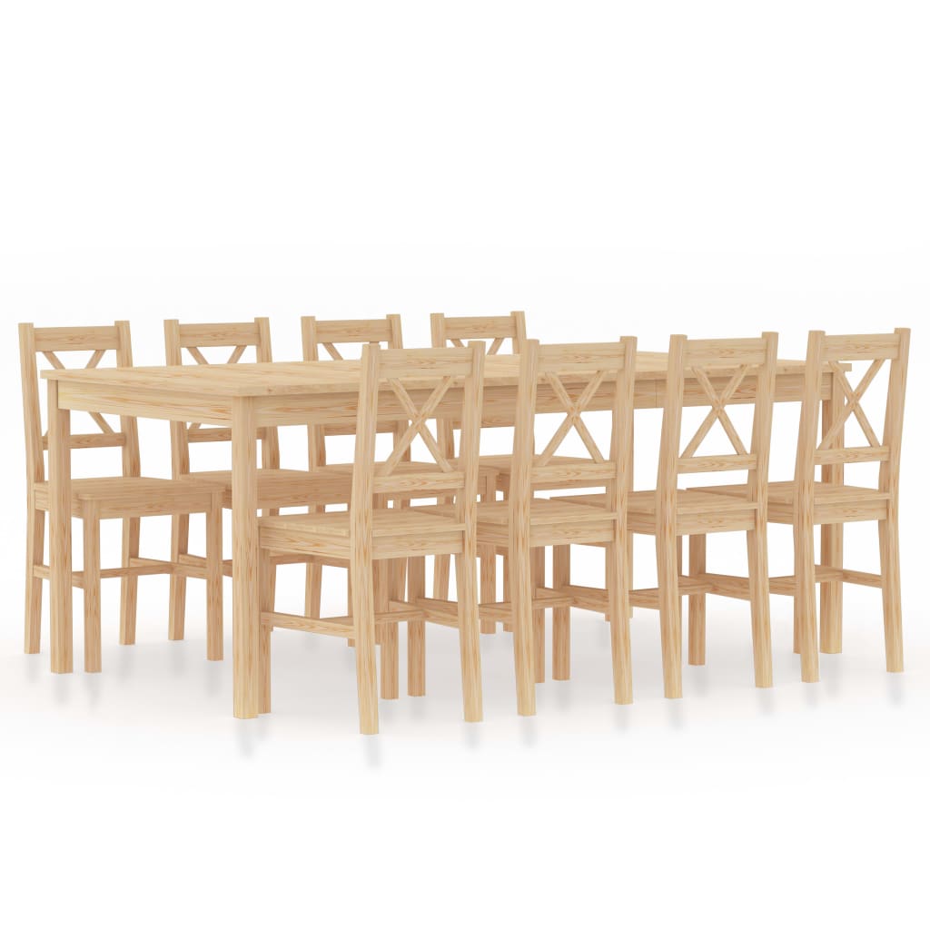 Bringen Sie einen Hauch von minimalistischem und elegantem Charme in Ihr Interieur mit dieser Essgruppe aus Holz! Sie besteht aus 1 Tisch und 8 Stühlen und ist eine fabelhafte Wahl für Ihre Küche oder Ihr Esszimmer. Der Esstisch und die Stühle aus hochwertigem Kiefernholz sind äußerst stabil und langlebig. Darüber hinaus lässt sich diese Essgruppe einfach montieren und mit nur einem feuchten Tuch leicht reinigen. Die Lieferung enthält 1 Tisch und 8 Stühle.